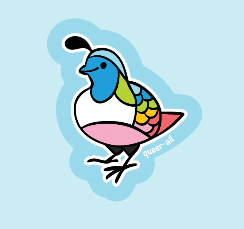 Subtle, punny pride flag animal stickers. Part of the pride-imals series by Robin Good Art & Design. Waterproof and scratch-resistant, perfect for your water bottle, laptop, bike helmet or more. Full-colour digital print on vinyl, matte laminated, cut to shape. Size: 2" - 2.5" wide. Printed locally in Edmonton, AB Canada.